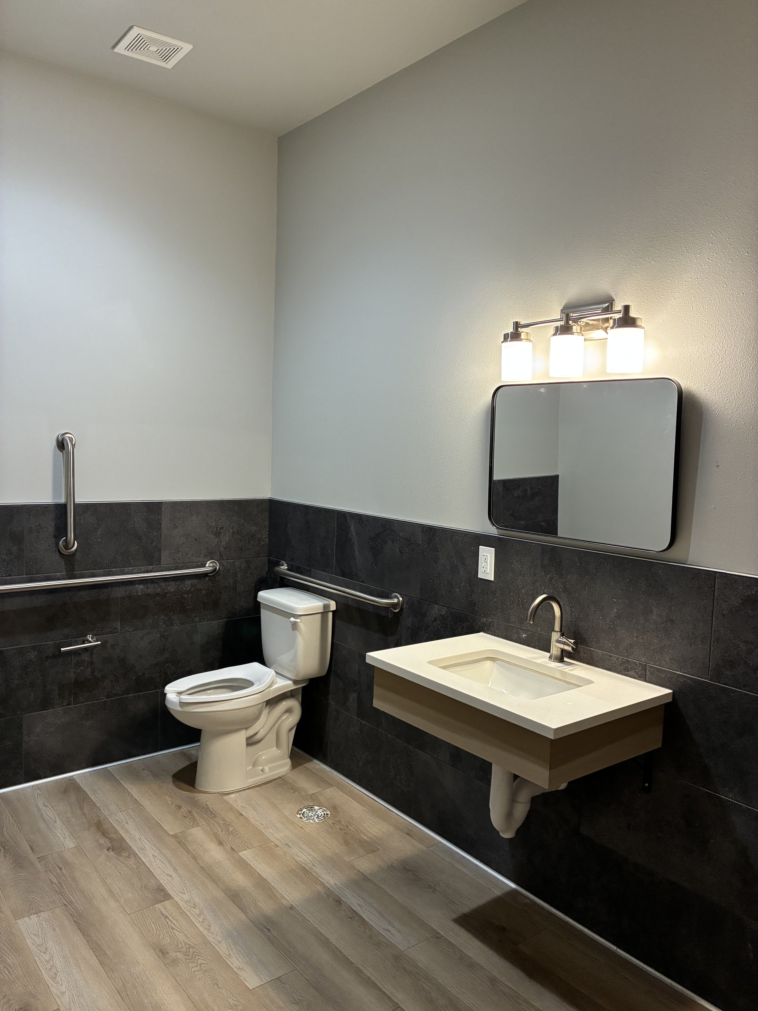 Shared and regularly maintained facilities for tenants and visitors, located conveniently within the main building corridor. ADA accessible with changing table.